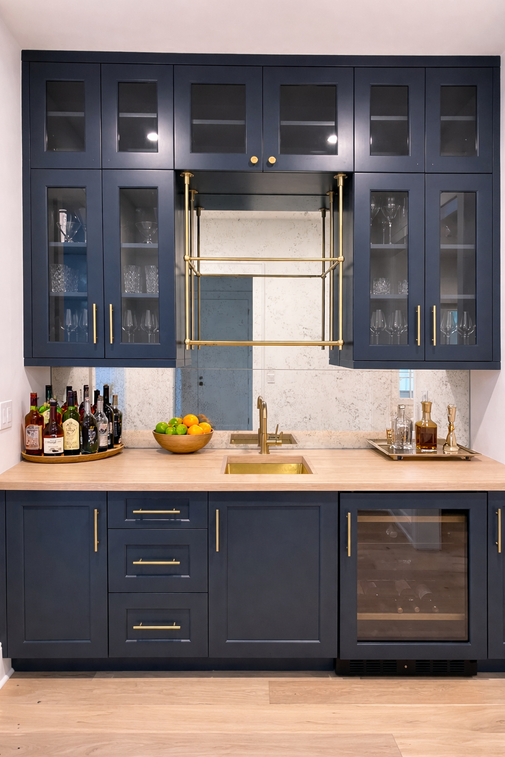 The bar was designed as a moment of contrast and sophistication. Rich cabinetry, metal accents, and reflective surfaces give the space depth, while maintaining alignment with the overall palette. It serves as a functional focal point—both a destination for entertaining and a seamless extension of the adjacent living areas.