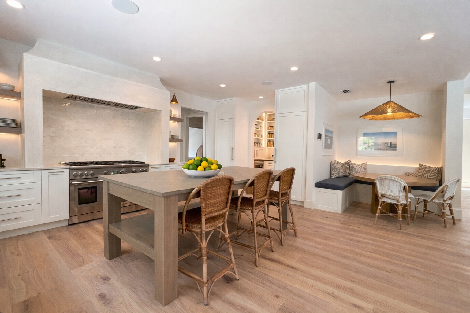 The kitchen anchors the home with a balance of simplicity and presence. A furniture-style island introduces warmth and approachability, while integrated appliances and clean-lined cabinetry keep the space visually quiet. Layered lighting and natural textures create a setting that feels equally suited for everyday living and entertaining.