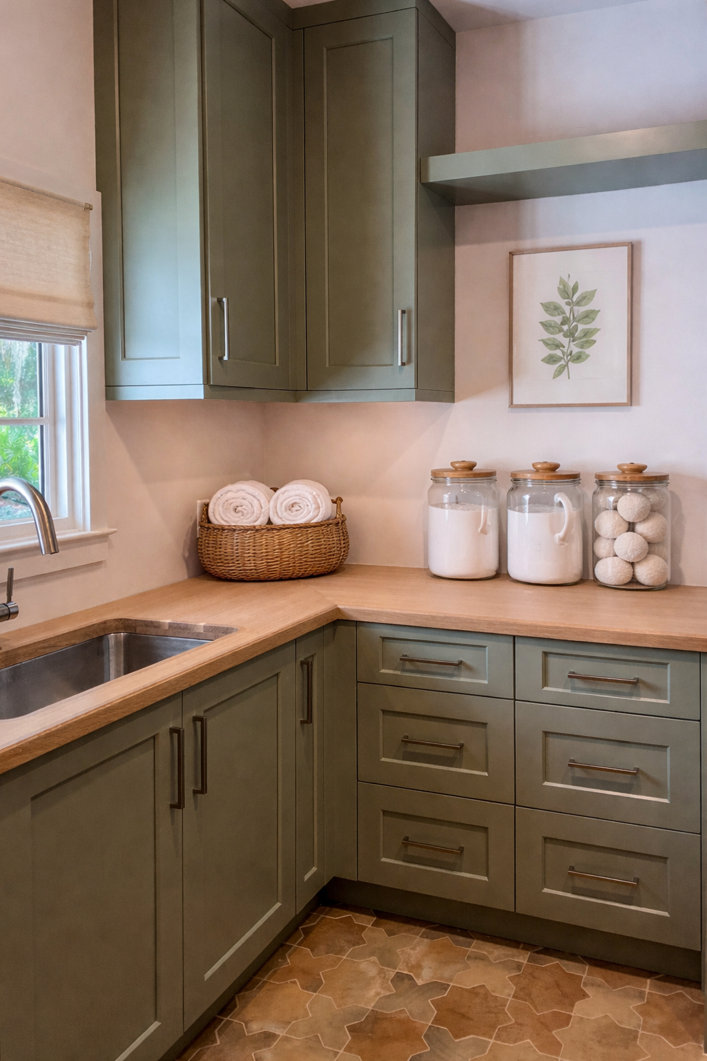 A thoughtfully designed laundry space that blends function with warmth. Soft sage cabinetry, natural wood surfaces, and tailored storage details create an environment that feels calm, organized, and effortlessly refined.